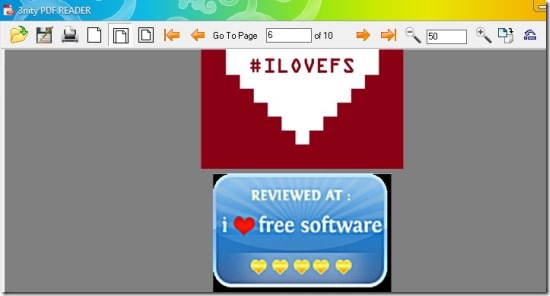 3nity PDF Reader provides a simple interface that supports drag n drop facility like other similar pdf readers. You can open your pdf file and can zoom in/zoom out to read it comfortably. Moreover, it also lets you rotate your pdf file. It is helpful in case you have a page or an image in your file which is not in right position. You can rotate it clockwise to make it easily viewable. All the options are available at top part of its window.