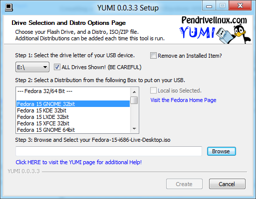 The Yumi setup screen consists of a single window which allows the user to select their flash drive or hard drive, OS, and its ISO file (you can download most of the free OS from PenDriveLinux.com). A small box shows the distribution files available and which can be stored in the usb. A smaller box allows the user to choose the ISO from a given list. The distribution list has numerous operating systems, system tools, antivirus scanners, troubleshooting tools and other tools. Only one distribution can be added to USB in one go, and you can repeat the process to add more.