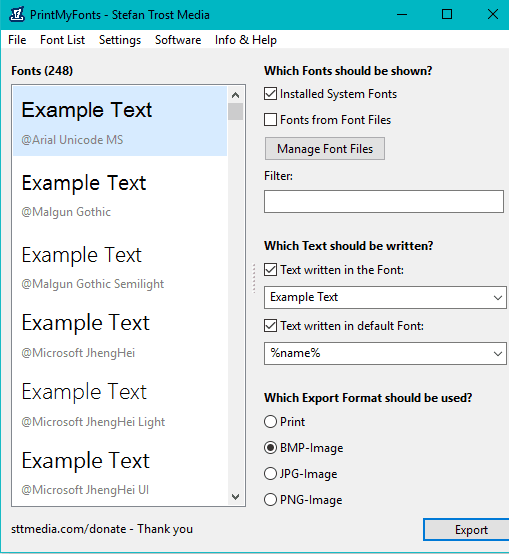 When you have previewed all the fonts, you can choose the export format (BMP, PNG, and JPG) to save the list of fonts using the right section.