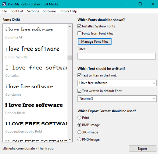 Apart from this, it also lets you export the full list of fonts. You can either take the print of fonts list or can export them as JPG, BMP. or PNG images. If fonts list is too big, then it will generate multiple output images. However, you can also customize the settings to set the maximum number of fonts per image. Still, if you find the output is too messy or having a lot of images, then you can simply export the list as RTF or HTML file. All these couple of fantastic features make it a better font viewer.