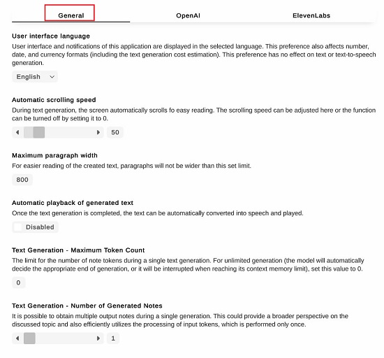 6. The ‘General’ tab enables you to customize general settings related to Max. token count, Number of generated Notes, Working directory, configuration file, and other parameters.