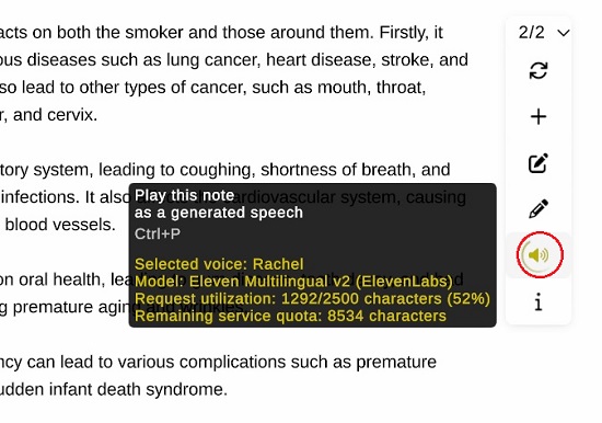 11. You can click on the ‘Speaker’ icon in the toolbar to play the Note as generated speech using the ElevenLabs audio service.