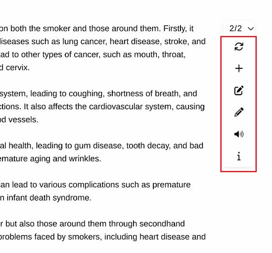 10. Click anywhere on the generated text and observe a mini toolbar pops up towards its right. You can click on the respective icons in this toolbar to Generate a New Note with the same query, Create a New Note with another query, Create a New Note using the present note’s text and Edit the note if required. Keyboard Shortcuts have been provided for each of the above actions. You can hover your mouse cursor over any of the icons to find out shortcut keys as well as to get more details.
