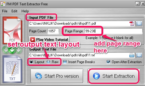 Note: Pro version is also available for this PDF text extractor software which helps to extract text as well as images from multiple PDF files simultaneously. You can use pro version as demo, but it will be able to extract only first 3 PDF pages. You can upgrade for more beneficial features or else continue use this free version.
