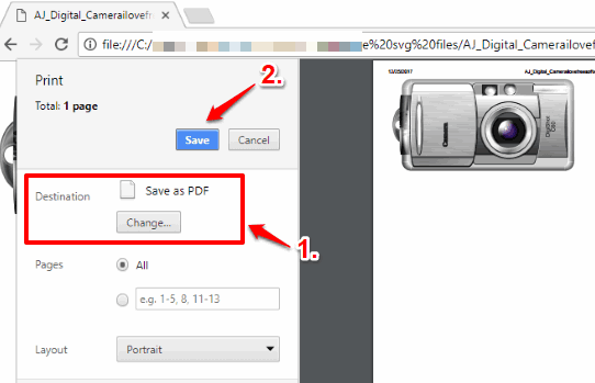 Converting a SVG to PDF file is very easy using Chrome browser. Simply right-click on a SVG file and select open with Google Chrome option. The SVG file will open in a new tab in Chrome browser. After that, you need to press the print command (“Ctrl+P“). In the Print window, select Destination to “Save as PDF” and then click on Save button. A window will open using which you can save SVG file as PDF file to your PC.
