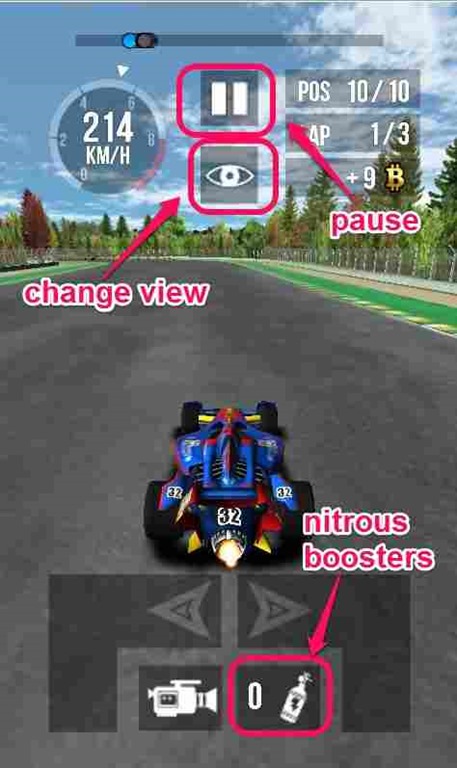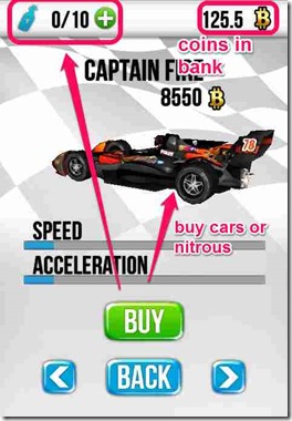 There is no acceleration button in the game as because the car accelerates on its own when the game starts. Yes! you can speed up your car at times by using the nitrous boosters. Oh!! that reminds me something, there are 10 nitrous that you are provided initially in the game (I used them all pretty quickly). You can buy more of these with the coins that you collect in the game.
