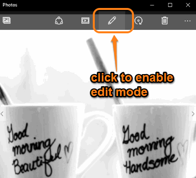 Step 1: Open a photo in Windows 10 Photos App. After this, click on Edit icon.