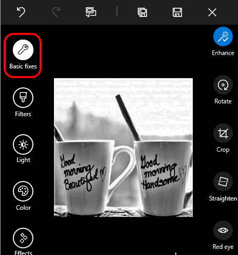 - Basic fixes: This menu gives you an option to enhance your photo in a single-click automatically. Apart from this, you can also use options to crop, rotate photo, remove red-eye, etc.