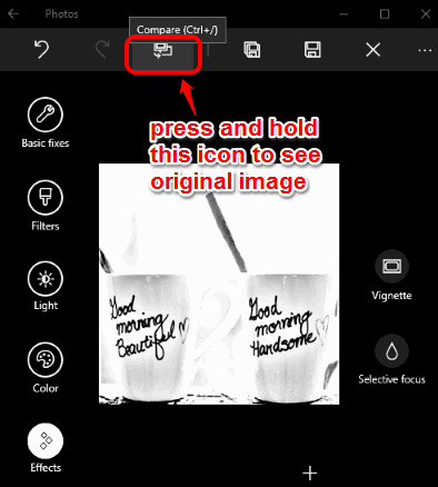 Step 3: You can use Compare icon to check difference between original and edited photo. However, it doesn’t provide side by side comparison. You need to press and hold Compare icon to view the original image and release the button to see enhanced image.