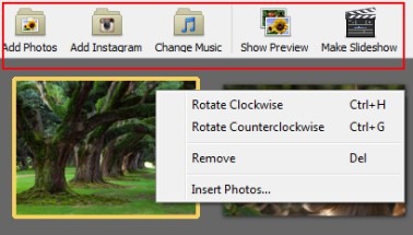 As you can see in the below screenshot, 5 tabs are available. Add Photos tab will help you to add photos directly from your computer. After adding photos, you will find more options for a particular photo by right-clicking on a photo. Options such as rotate it, remove it etc. Use these options to easily modify your photos.