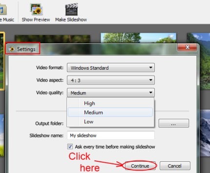 You can click on Make Slideshow tab and it will open a small window. In this window, you can select the output format, aspect ratio, and video quality for your slideshow. Other than this, you can change the slideshow name and output format according to your own wish.