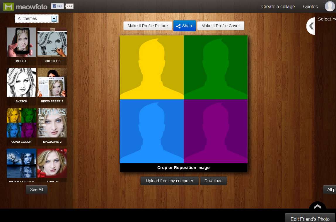Meowfoto is a free online Facebook photo editor which allows you to edit your Facebook images online, without having to re-upload them from your computer, but you can do that also if you want. You can add cool effects and filters, create collages, edit friends photos and insert meaningful text quotes to the images. Meowfoto accesses your images and photos directly from your Facebook albums.