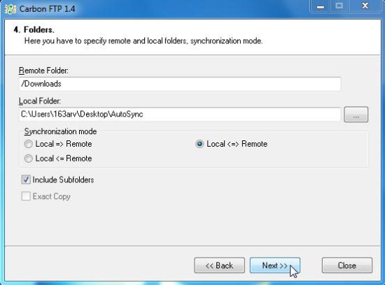 CarbonFTP comes with a wizard like interface that lets you easily select the folders that you want to sync, direction of syncing, and file types that you want to sync. After this, CarbonFTP will start the sync process, and will sync your local and FTP files.