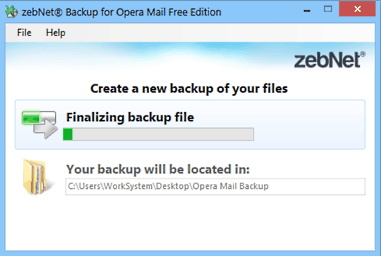 Step 2: Once you’ve selected a backup location and ensured that everything else is in place, all that remains to be done is to initiate the backup process. To do so, simply select the Backup now option. zebNet backup will instantly swing into action and within mere seconds, all of the email messages stored/accessible in your Opera Mail client will be saved as a single backup file, saved to the location specified by you. You can check the estimated time remaining until the backup completes via the progress bar displayed by the program. zebNet Backup for Opera Mail will also notify you once the backup is finished. Simple as pie!