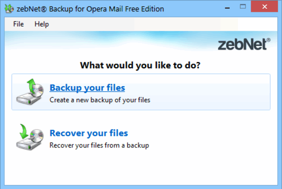 As the above screenshot instantly makes clear, zebNet backup for Opera Mail sports an exceedingly straightforward and practical user interface. There are just two options up and front: one that lets you backup your Opera Mail content, and other that lets you restore the backed up data back to Opera Mail.