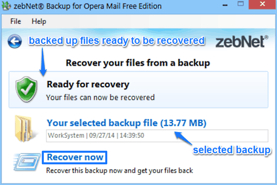 Step 2: Now that everything is set, feel free to go ahead and select the Recover now option. As you do it, zebNet Backup for Opera Mail will power up, and restore all of your important backed up email messages to Opera Mail. You can open up Opera Mail, and you’ll find all of your email messages there. As in the case of the backup operation, zebNet Backup notifies you of the time until restoration is complete, via a progress bar. How cool is that?