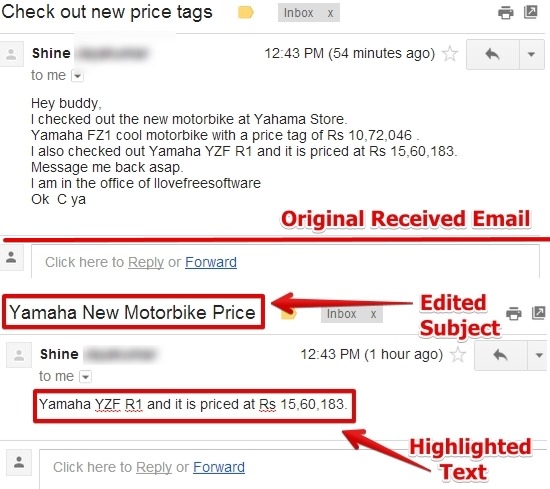 You can also add your own text to the email and highlight it. You can use Signal extension for received as well as sent emails. Why I really like Signal extension is because no matter whatever changes you do to the email, your original email will always be saved as it is and you can revert back the changes anytime.