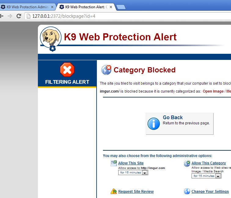 Image above shows us the blocked message that you’ll get when trying to access a website that is on the blacklist of this free Internet filtering software. With options down below you can access settings and change them so you can open the website, but in order to access the settings you need to know the control panel password that you’ve setup during K9 install.