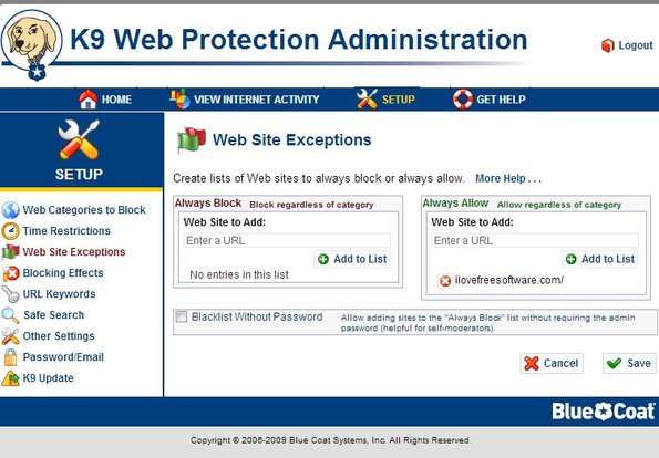 Click on Setup from the top menu so you can start tweaking settings. As you can see from the screenshot above, to exclude a website open up the Website Exceptions from the left sidebar. You can also monitor Internet activity and keep a log of when a blocked website is accessed by whoever uses K9. If you’re using K9 for your own web filtering, let your friend change the access password and ask him/her to give it to you only in case of life or death situations.