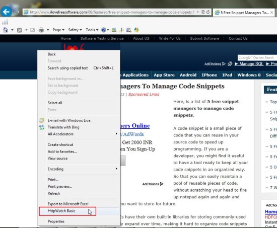 After installing HttpWatch in your system when you browse anything on Internet Explorer or Mozilla Firefox, you simply need to choose the “HttpWatch (Basic or Professional)” option from the context menu you get by right-clicking anywhere on the webpage. This will open a panel at the bottom of the browser window displaying detailed HTTP information on the webpage you are on.