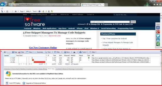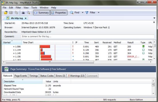 The program is available in two different versions: Basic and Paid. Though the paid version offers more features on spending a few bucks, the free version is equally good. HttpWatch captures a wide range of HTTP data including headers and cookies, URLs and methods (GET, POST, etc.), HTTP errors and status codes, POST request and query string parameters, redirections, encoding, etc., and displays the exact HTTP information that gets triggered when a webpage is accessed. And for secure browser sessions, it automatically displays the decrypted form of HTTP related data.