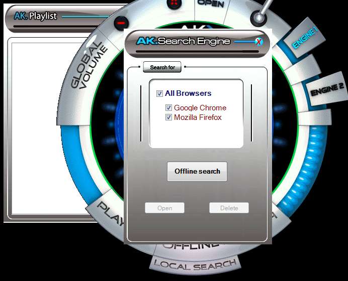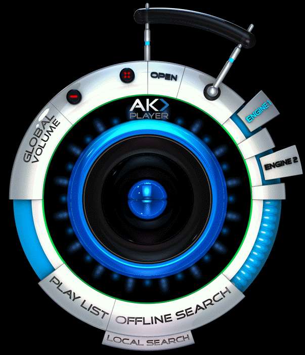 Interface of AK-Player 7 is very unusual, as you can see from the screenshot above. Futuristic would be the best word to describe what you’ll see after running this free media player for the first time, after seeing its control panel. All the options are spread out around the edges of the wheel. Open File is located all the way at the top, volume adjustment to the left, offline search for audio and video from both the browser cache and the rest of your hard drive is located all the way at the bottom.