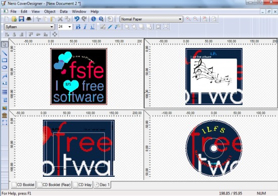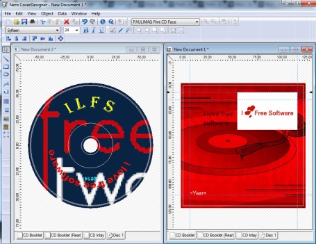 Nero CoverDesigner is a handy software to create your own custom CD labels, Inlays, and booklets. There are a bunch of templates available that you can use, or can simply create your own template for CD, DVD, and Blu-ray disc. With just some good effort, you can create a professional looking covers, that you can use for your discs. It lets you work with multiple documents for creating custom covers and helps to choose the type of shape (DVD Slim case, Multibox, Mini CD, etc.). You can add any supported image for CD cover and can also insert artist name, year, track list, disc title, etc.