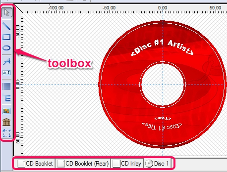 Click on OK button to work with your document. On its interface, a window will also open up where you need to fill document data (Title, Artist/Publisher/Year) for CD labels. You can change these details later on as well. Now you can create own custom CD/DVD/Blu-ray cover. At the bottom part of its interface, four tabs will be available that will help to switch to CD Booklet (front and rear), CD Inlay, and disc cover while working on your document.