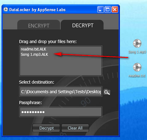 To decrypt files with DataLocker, we’re gonna open up the Decrypt tab on top of the application window. Just like with encryption, we’re gonna drag and drop the encrypted file to the list, specify where we want them decrypted and of course type in the password: