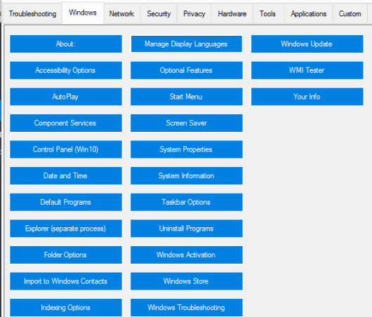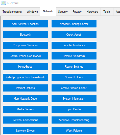 nuePanel is a free software to access Windows 150+ built-in applets, settings, and troubleshooting tools. Everything can be accessed using a single interface only. Whether you have to access Action Center, Disk Cleanup tool, Network Connections window, Windows Media Player, Control Panel, On-Screen keyboard, Start Firefox in Safe Mode, Event Viewer, Display DNS information, Calculator, or other items that are natively provided by Windows, you can access any of those items in a single click.