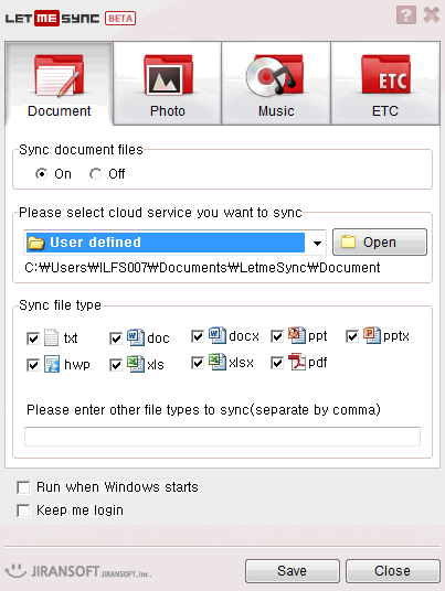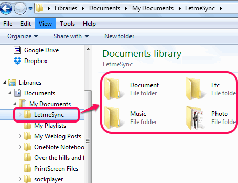 When you install LetMeSync on your PC, it create four folders: Documents, Photo, Music, Etc.