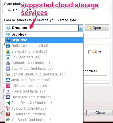 Dropbox, OneDrive, 2ndDrive, BizHard, Box, Carbonite, DaumCloud, EgnyteHybridCloud, JustCloud, LGCloud, NDrive, OpenDrive, SugarSync, TCloud, UCloud, YouSendIt, ZipCloud.