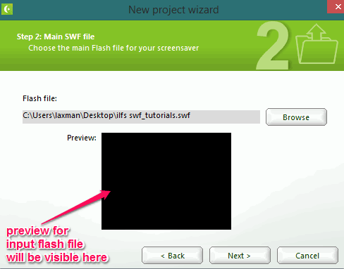 It provides a simple wizard using which you can quickly generate a screensaver from your swf file. Although you can also use a blank project that requires multiple steps, but using the wizard makes it more simple, and easy to create a screensaver with your favorite flash file.