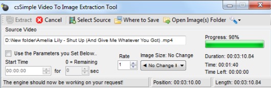 See the above screenshot that shows interface of csSimple Video To Image Extraction Tool where you need to take all actions to extract pictures from video.
