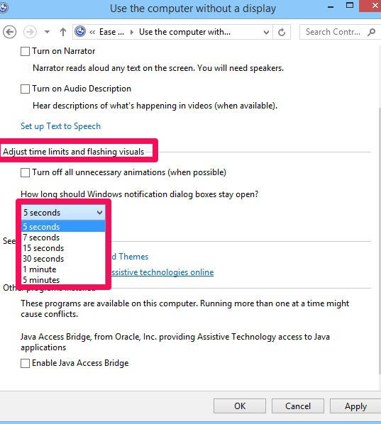 In both the above mentioned links, you will find a column that says “Adjust the time limits and flashing visuals”. Choose the time as per your preference from the pick-list. It also gives you 6 different options to choose from: 5 seconds, 7 seconds, 30 seconds, 1 minutes, and 5 minutes.