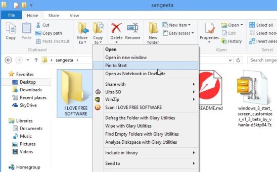 Pining a folder to Windows 8 Start Screen is all about two clicks only. Once you have the requisite folder containing the necessary files and folders; all you have to do is select the folder and right click, and then select Pin to Start item.