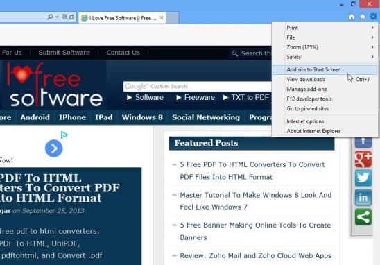 Pining a website is a very easy process. All you have to do is open Internet Explore 10 (default web browser in Windows 8), and simply open the website you visit the most. Once the website loads, simply click on the gear icon which is actually the tools button on the top right corner of browser, and select Add site to Start Screen. That’s pretty much it!