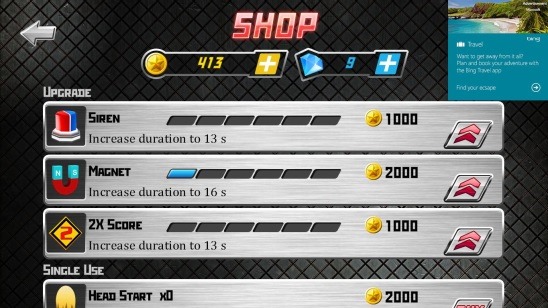 All the power-ups works in a similar way as the powers in Temple Run do. They all have limited time, and last for a limited time period. Each power up adds different abilities to your bike, for example Magnet, which automatically attracts the nearby coins, the siren power clears a specific part of the road ahead of you, and many more. All of these are present in the Shop screen within the app. You can go to the Shop screen by clicking on the $ button in the Main Screen.