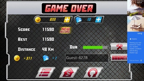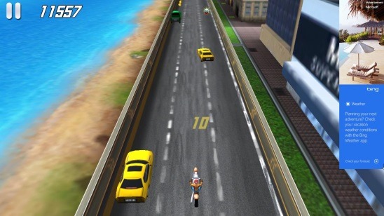 As a free racing game, this Windows 8 bike racing game sure is fun. The game is in 3D and the graphics are good, also the sound is quite okay. The gameplay is very good. You’ll start on road which is at first empty, but slowly gets crowded with trucks, cars, and buses etc. These all are basically the obstacles, that stand on your way and block you from achieving high score. All you have do is dodge these obstacles, by turning left or right, and grab as many coins and power ups as possible. Grabbing these coins helps you get to the highest score, and different power-ups helps in grabbing the coins easily. Also overtaking the vehicles adds few but countable points to your score. Following is a screen shot of the gameplay.