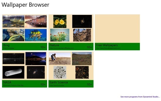 The main interface of the app consists of different tiles that enables to view wallpapers from different sources like Bing, Nature, NASA, Earth Science etc. The first time I launched the app it took a few seconds to load up the preview pictures in the tile. Now that you have launched the app, you will have the main interface in front of you as seen above.