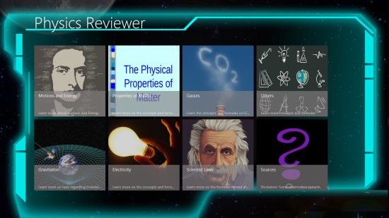 Physics Reviewer is a Windows 8 Physics App. The app can be used to get factual information about various Physics facts like Motions & Energy, Properties of matter, Gases, Gravitation, Electricity, about various laws that have been proposed by scientists, and various other things.