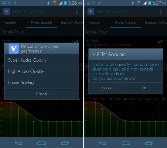 Then you will be presented with the quality of audio as seen here, chose the one you want. I chose ‘super audio quality’ as I wanted to see the true capability of app. It does warn you that minimum dual core processor are required and it may speed up the battery drain.choose audio quality Viper4Android Audio Effects