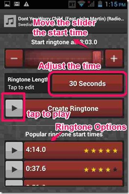 Step 4: In case you chose one of the song options that this app provided, then it will also show “popular ringtone start times” for that song, based on ringtones that other users have created for that song, as you can see in screenshot below. If you click on any of the popular ringtones start time, then the app will set start time of the song to that time.