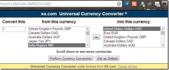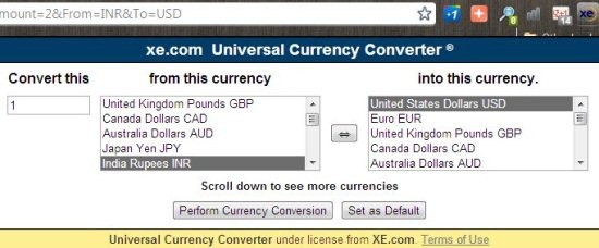 XE Currency Converter is a free currency converter Chrome extension to convert currencies of different countries on Google Chrome. The extension has simple logic to convert currency. It works online on Google Chrome. You just have to launch the extension, select the base country and other country, and then click on “perform currency conversion” button in the extension. XE Currency Converter extension will divert you to its website which shows the converted currency which you requested. You can also set the value to convert.