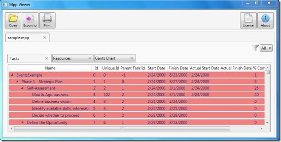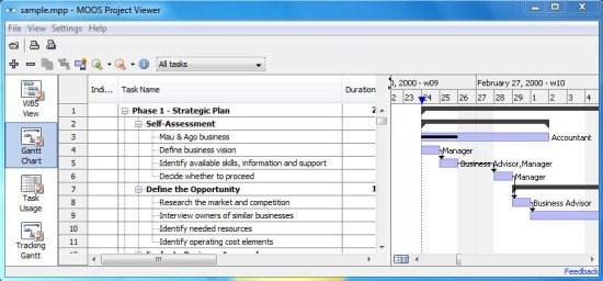 MPP Viewer is a free software to view Microsoft Project files. It’s a simple and easy to use Viewer application, which allows you to open and view files developed in Microsoft Project. This free MPP Viewer comes with a nice, user-friendly interface. The program window comprises of three different tabs: Tasks, Resources, and Gantt Chart. The Tasks tab displays all the project tasks in a tree hierarchy. The Resource tab groups all the tasks by resources, and allows you to view tasks associated with different resources. The Gantt chart tab illustrates the project schedule using bar graph representation.
