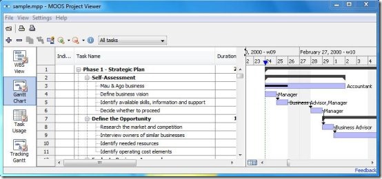 Moos Project Viewer is a free MPP Viewer that lets you open and view Microsoft Project files. It’s a powerful software, which facilitates viewing Microsoft Project files in a dynamic way. This free MPP Viewer supports opening all Microsoft Project file types, including .mpp, .mpt, .mpx, and .xml. It provides a wide range of views to dynamically and systematically analyze your Microsoft Project files. These views include WBS (Work Break Down structure: a detailed breakdown of the project tasks), Gantt Chart (bar graph representation of project schedule), Task Usage, Team Planner, Resource Sheet, Resource Usage, and Tracking Gantt. The Gantt Chart view offers a wide timeline scale, ranging from minutes to years.