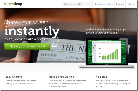 Screenleap is a free screen sharing online service that lets you share your screen with your friends, colleagues, associates, and other team members, with one click. Using this free screen sharing application you can either opt to share full screen or else you can share the screen located inside the green rectangular box. You can simply share the direct share link and unique code with those people with whom you wish to share the screen. Grab this free screen sharing application to instantly share your screen with one click.