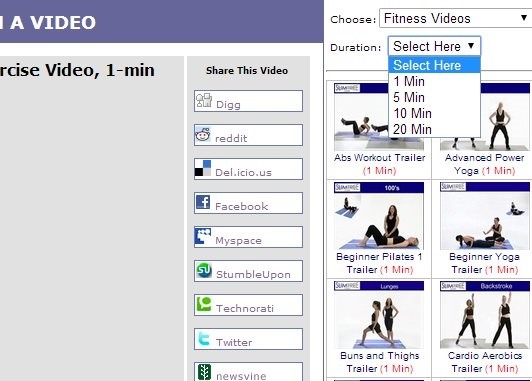Second website in the list, to learn Aerobics online is Slim Tree. You have to begin by creating a free account, after which you can watch different workout videos. The website provides you different videos on aerobics, Yoga and Gym training. You can filter your search by searching for the type of exercise you want to learn. You can also filter the videos by its length. There are both short videos (1min long) and long descriptive videos (5, 10, 20 minutes long). The videos that you watch and learn from can also be shared on other platforms like Facebook, Twitter, Reddit.