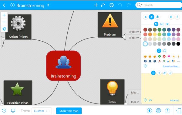This is a brainstorming template that you see. MindMeister requires registration. Toolbar is located on the right and another one down below where there’re options for printing and saving created mind maps. With the free version of MindMeister you’ll only be able to export your mind map as .mind, .pdf, .rtf and .png. Exports to Google Drive also supported.