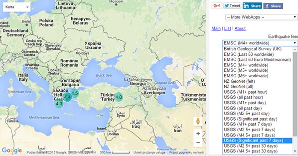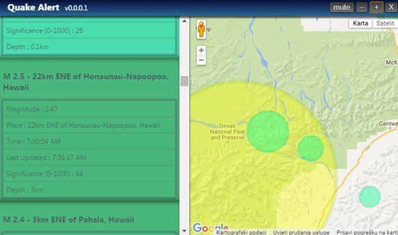 It will open up in a new window. In the left sidebar the earthquake feed is located, while on the right Google Map is displayed that shows you location of the quakes. Audio notification will play as new earthquake updates are coming in. Usual info about reported earthquakes is given, location, time, magnitude, depth and significance.